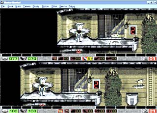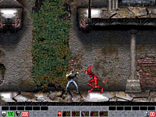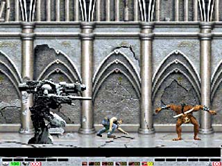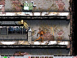 Those ever-reliable Bad Old Aliens have captured these two combatants and put them into a dark, industrial warren of tunnels and platforms for the purposes of entertainment. The two SGI-rendered, motion-capture combatants pursue each other around and through crumbling halls, pits, traps, and automated defenses, starting the game unarmed and eventually locating whips, guns, rocket launchers, ammo, and other resources in their search-and-destroy competition.