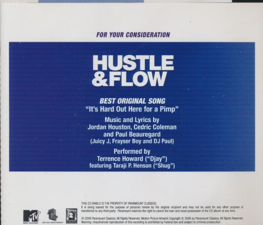 Music and Lyrics by Jordan Houston, Cedric Coleman and Paul Beauregard (Juicy J, Frayser Boy and DJ Paul). Performed by Terrence Howard ("Djay") featuring Taraji P. Henson ("Shug"). © 2006 Paramount Classics. Promotional material for awards consideration.