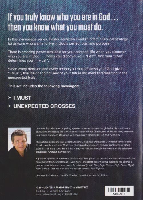 I Am, I MustIf you truly know who you are in God ... then you know what you must do. In this 2-message series, Pastor Jentezen Franklin offers a Biblical strategy for anyone who wants to live in God's perfect plan and purpose. There is amazing power available for your personal life when you discover who you are in God . . . when you discover your "I Am". And your "I Am" determines your "I Must". When every decision and every action you make follows your God-given "I Must", this life-changing view of your future will even find meaning in the unexpected trials. This set includes the following messages:
