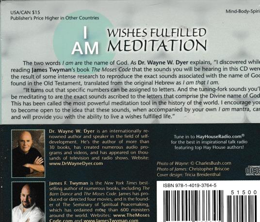 The two words I am are the name of God. As Dr. Wayne W. Dyer explains, “I discovered while reading James Twyman’s book The Moses Code that the sounds you will be hearing in this CD were the result of some intense research to reproduce the exact sounds associated with the name of God found in the Old Testament, translated from the original Hebrew as I am that I am. “It turns out that specific numbers can be assigned to letters. And the tuning-fork sounds you'll be meditating to are the exact sounds ascribed to the letters that comprise the Divine name of God. This has been called the most powerful meditation tool in the history of the world. I encourage you to become open to the idea that these sounds, when accompanied by your own I am mantra, can and will provide you with the ability to live a wishes fulfilled life.”
