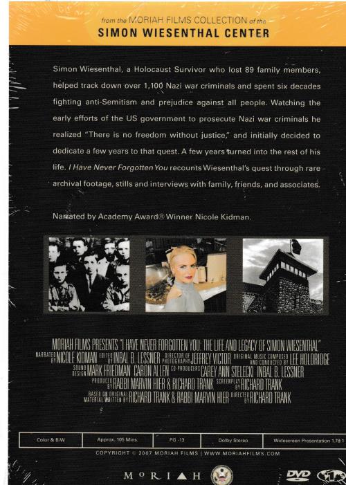 from the MORIAH FILMS COLLECTION of th, SIMON WIESENTHAL CENTER Simon Wiesenthal, a Holocaust Survivor who lost 89 family members, helped track down over 1,100 Nazi war criminals and spent six decades fighting anti-Semitism and prejudice against all people. Watching the early efforts of the US government to prosecute Nazi war criminals he realized "There is no freedom without justice;' and initially decided to dedicate a few years to that quest. A few years tu rned into the rest of his life. / Have Never Forgotten You recounts Wiesenthal's quest through rare archival footage, stills and interviews with family, friends, and associates. Narrated by Academy Award® Winner Nicole Kidman.
