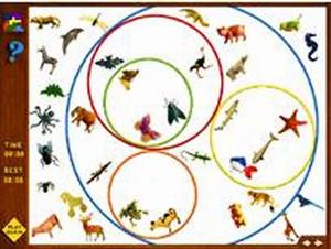 In Oops Hoops, a timed activity, objects must be classified, sorted and placed into categories within hoops. Objects belonging to two categories are placed where hoops intersect. For example, one hoop might contain red objects and another food types -- red, food or red-food objects are placed in the area where they cross.
