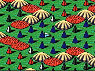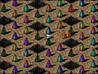 Although red pyramids are deadly to the touch, they can be shot, but only your enemies can destroy green ones. The catch is that all three types (red, blue and green) frequently change color, blue turning to green, green to red and red to blue. Purple pyramids must be shot as well and when destroyed, create pits that are fatal if you get too close. White pyramids are made of concrete and must be shot ten times. Rainbow pyramids can turn to blue, green, red or purple or become a seeker.