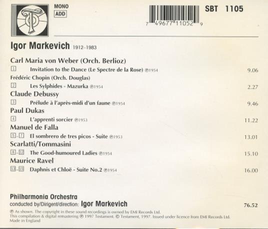 Igor Markevich was a renowned conductor and composer, known for his interpretations of classical orchestral works. This album features the Philharmonia Orchestra performing a selection of pieces honoring Sergei Diaghilev, showcasing Markevich's skillful direction and the orchestra's dynamic range. The collection includes works by notable composers such as Weber, Chopin, Debussy, Dukas, Falla, Scarlatti, Tommasini, and Ravel, capturing a rich vein of early 20th-century classical innovation. The album highlights the diversity and depth of ballet-inspired orchestral music.