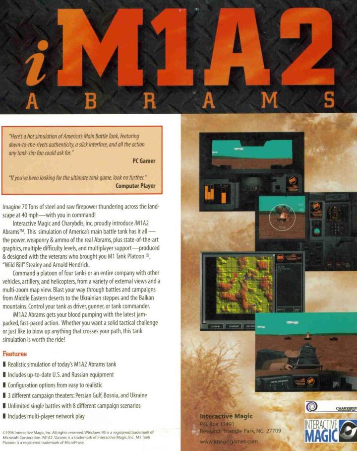 Interactive Magic and Charybdis, Inc. proudly introduce iM1A2 Abrams. This simulation of America's main battle tank has it all - the power, weaponry and ammo of the real Abrams, plus state-of-the-art graphics, multiple difficulty levels, and mutiplayer support - produced and designed with the veterans who brought you M1 Tank Platoon, "Wild Bill" Stealey and Arnold Hendrick.