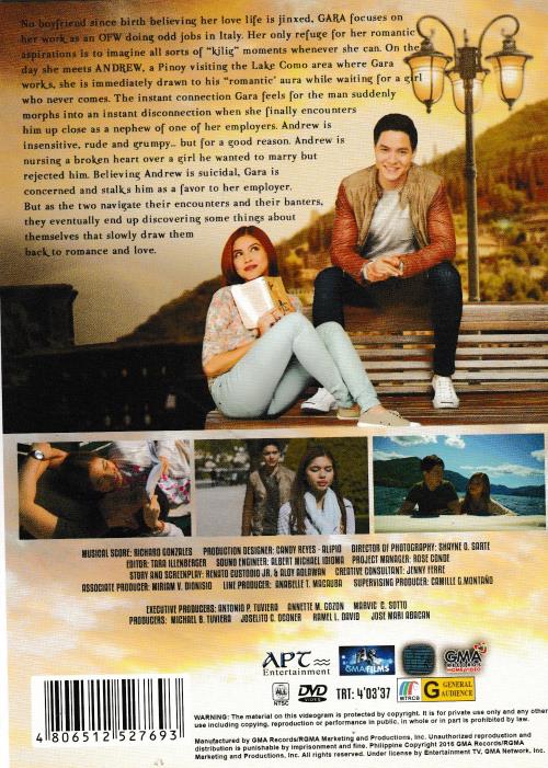 No boyfriend since birth believing her love life is jinxed, GARA focuses on her work as an OFW doing odd jobs in Italy. Her only refuge for her romantic aspirations is to imagine all sorts of “kilig” moments whenever she can. On the day she meets ANDREW, a Pinoy visiting the Lake Como area where Gara works, she is immediately drawn to his “romantic’ aura while waiting for a girl who never comes. The instant connection Gara feels for the man suddenly morphs into an instant disconnection when she finally encounters him up close as a nephew of one of her employers. Andrew is insensitive, rude and grumpy… but for a good reason. Andrew is nursing a broken heart over a girl he wanted to marry but rejected him. Believing Andrew is suicidal, Gara is concerned and stalks him as a favor to her employer. But as the two navigate their encounters and their banters, they eventually end up discovering some things about themselves that slowly draw them back to romance and love. No English subtitles.