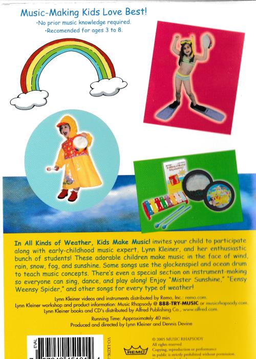 In AU Kinds of Weather, Kids Make Music! invites your ( hcicl I. port', 'pot,. along with early-childhood music expert, Lynn Kleiner, and bunch of students! These adorable children make music cn the t, .• if► wind rain, snow, fog, and sunshine. Some songs use the glockenvi•l . nft. (►( .•nn drum to teach music concepts. There's even a special section on ins trunwto so everyone can sing, dance, and play along! Enjoy "Mister !Ain•;I►in►," "I ►-t•.y Weensy Spider," and other songs for every type of weat hcrl