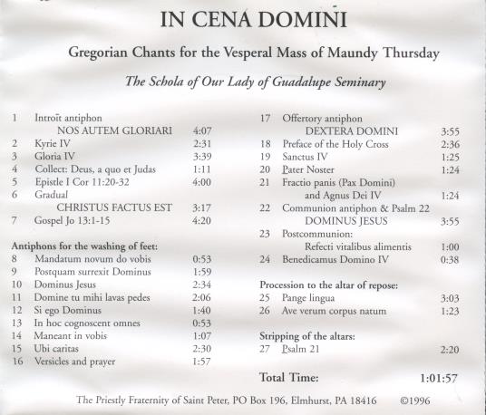 In Cena Domini Gregorian Chants For Maundy Thursday MUSIC AUDIO CD Vesperal Mass