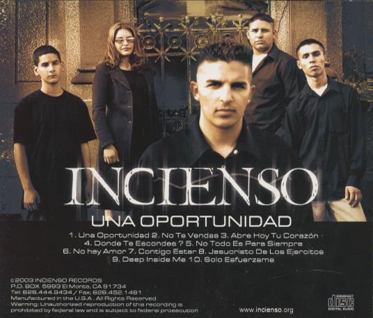 Incienso is a Spanish-language Christian band that blends worshipful lyrics with contemporary rock and Latin pop influences. Their album Una Oportunidad features emotive guitar-driven arrangements and Spanish-language praise songs. The band delivers heartfelt messages of faith and hope aimed at both youth and adult listeners. Musically the group combines melodic hooks with driving rhythms and congregational choruses.