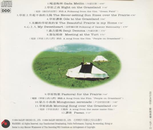 This compilation presents traditional Inner Mongolian songs and instrumental pieces drawn from the region's pastoral culture. The selections range from rousing dance tunes and film themes to intimate folk ballads and minority songs. Performances feature traditional vocal styles and acoustic instrumentation that evoke the grassland's vast landscapes. Several tracks are taken from films such as "Green Field" and "People on Grassland", giving the set a cinematic, narrative quality.
