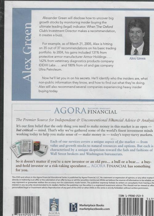 Alexander Green will disclose how to uncover big growth stocks by monitoring insider buying the ultimate leading (legal) indicator. When The Oxford Club's Investment Director makes a recommendation, it creates a buzz. For example, as of March 21, 2005, Alex is hitting on 35 out of 37 recommendations on his basic trading portfolio. In 2004, his gains included 131Ͽrom protective armor manufacturer Armor Holdings ... 162Ͽrom veterinary diagnostics products company • IDEXX Labs ... and 180Ͽrom oil and gas company Ultra Petroleum. Now he'll let you in on his secrets. He'll identify who the insiders are, what non-public information they know, and how to find out what they're doing. Alex will also recommend several companies experiencing heavy insider buying today.