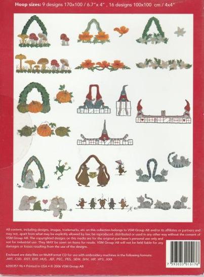 Stitch files in formats specified on the back of the cover ( .ART, .CSD, .DST, .EXP, .HUS, .JEF, .PEC, .PES, .SEW, .SHV, .VIP, .VP3 .XXX) PDF-sheets for print out including: