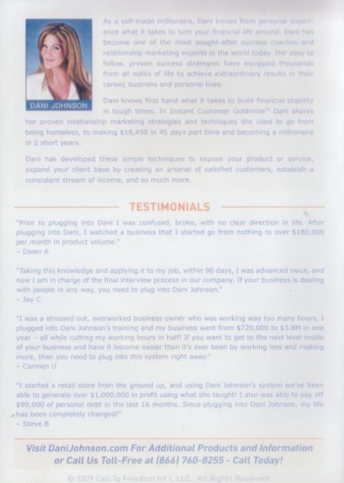 In Instant Customer Goldmine Dani shares her proven relationship-marketing strategies and techniques she used to go from being homeless to making $18,450 in 45 days part time, and to becoming a millionaire in two short years. She reveals simple techniques to expose your product or service, expand your client base by creating an arsenal of satisfied customers, establish a consistent stream of income, and much more.