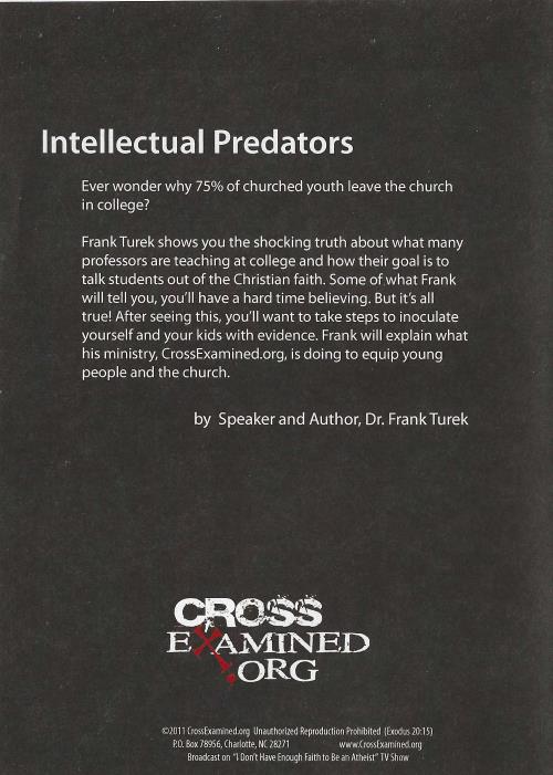 Intellectual Predators Ever wonder why 75Ͽf churched youth leave the church in college? Frank Turek shows you the shocking truth about what many professors are teaching at college and how their goal is to talk students out of the Christian faith. Some of what Frank will tell you, you'll have a hard time believing. But it's all true! After seeing this, you'll want to take steps to inoculate yourself and your kids with evidence. Frank will explain what his ministry, CrossExamined.org, is doing to equip young people and the church. by Speaker and Author, Dr. Frank Turek