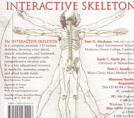 The world's first complete 3D digital skeleton. Every bone can be viewed in 3D and labeled from any point of view. All landmarks and muscle attachments can appear as 3D areas on the relevant image at the click of a mouse. The content, however, includes not just bones but a range of dissection images, radiographs and text covering major anatomical features. For medical students, nurses, paramedics, high school biology students - anyone studying anatomy - the CD ROM can act as a replacement for a real skeleton specimen, at a fraction of the price, but with so much more information at your fingertips.