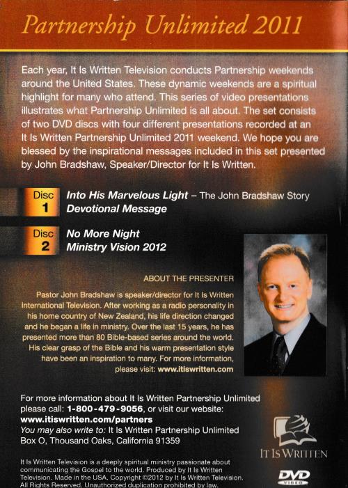 Each year, It Is Written Television conducts Partnership weekends around the United States. These dynamic weekends are a spiritual highlight for many who attend. This series of video presentations illustrates what Partnership Unlimited is all about. The set consists of two DVD discs with four different presentations recorded at an It Is Written Partnership Unlimited 2011 weekend. We hope you are blessed by the inspirational messages included in this set presented by John Bradshaw, Speaker/Director for It Is Written. Disc Into His Marvelous Light — The John Bradshaw Story Devotional Message No More Night Ministry Vision 2012 ABOUT THE PRESENTER Pastor John Bradshaw is speaker/director for It Is Written International Television. After working as a radio personality in his home country of New Zealand, his life direction changed and he began a life in ministry. Over the last 15 years, he has presented more than 80 Bible-based series around the world. His clear grasp of the Bible and his warm presentation style have been an inspiration to many.