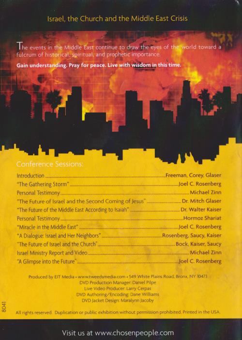 The events in the Middle East continue to draw the eyes of t fulcrum of historical spiritual, and prophetic importance. Gain understanding. Pray for peace. Live with wisdom in this ti 00 Introduction Freeman, Corey. Glaser "The Gathering Storm" Joel C. Rosenberg Personal Testimony Michael Zinn "The Future of Israel and the Second Coming of Jesus" Dr. Mitch Glaser "The Future of the Middle East According to Isaiah" Dr. Walter Kaiser Personal Testimony Hormoz Shariat "Miracle in the Middle East" Joel C. Rosenberg "A Dialogue: Israel and Her Neighbors" Rosenberg, Saucy, Kaiser "The Future of Israel and the Church" Bock, Kaiser, Saucy Israel Ministry Report and Video Michael Zinn "A Glimpse into the Future" Joel C. Rosenberg