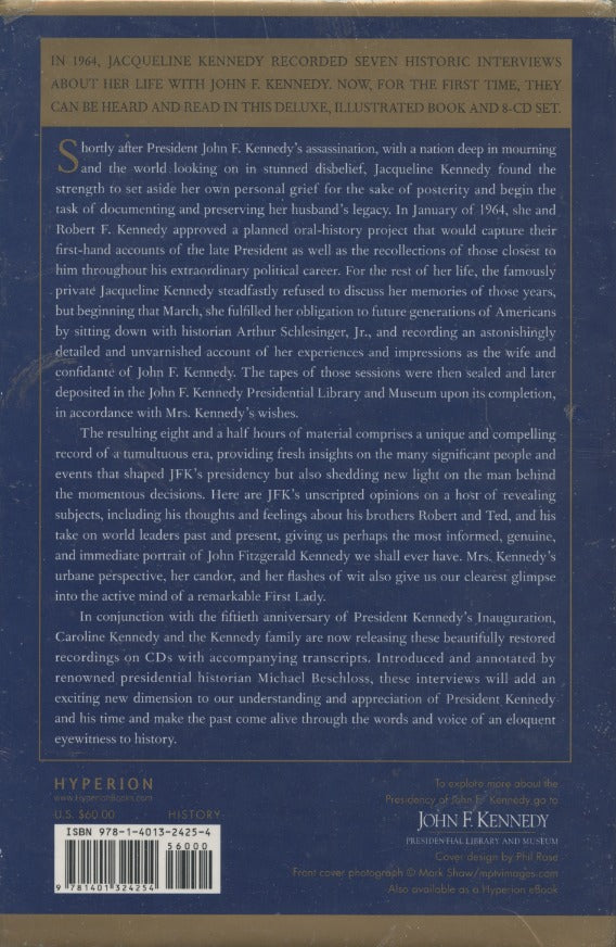 Shortly after President John F. Kennedy's assassination, with a nation deep in mourning and the world looking on in stunned disbelief, Jacqueline Kennedy found the strength to set aside her own personal grief for the sake of posterity and begin the task of documenting and preserving her husband's legacy. In January of 1964, she and Robert F. Kennedy approved a planned oral-history project that would capture their first-hand accounts of the late president as well as the recollections of those closest to him throughout his extraordinary political career. For the rest of her life, the famously private Jacqueline Kennedy steadfastly refused to discuss her memories of those years, but beginning that March, she fulfilled her obligation to future generations of Americans by sitting down with historian Arthur Schlesinger, Jr., and recording an astonishingly detailed and unvarnished account of her experiences and impressions as the wife and confidante of John F. Kennedy. The tapes of those sessions were then sealed and later deposited in the John F. Kennedy Presidential Library and Museum upon completion, in accordance with Mrs. Kennedy's wishes.