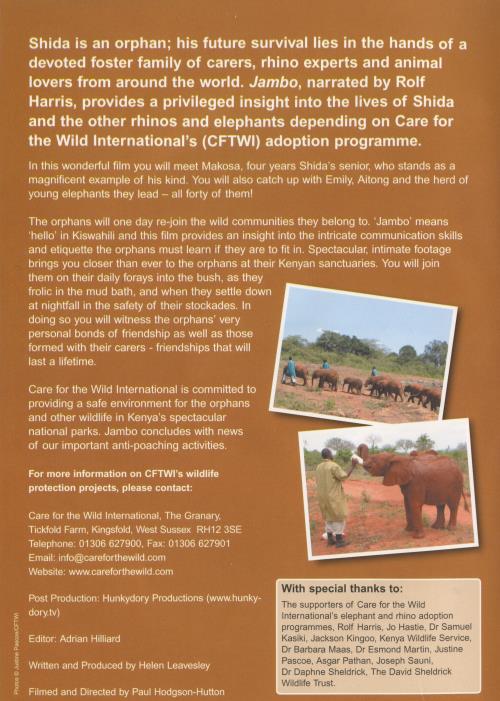 Shida is an orphan; his future survival lies in the hands of a devoted foster family of carers, rhino experts and animal lovers from around the world. Jambo, narrated by Rolf Harris, provides a privileged insight into the lives of Shida and the other rhinos and elephants depending on Care for the Wild International's (CFTWI) adoption programme.