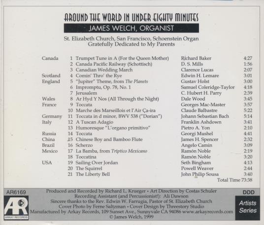 Recorded at St. Elizabeth Church, San Francisco, Schoenstein Organ. Gratefully dedicated to the artist’s parents. Produced and recorded by Richard L. Krueger. Art direction by Costas Schuler. Recording assistant (and percussionist): Ali Dawson. Cover photo by Ferne Saltzman. Cover design by Threestory Studio. © James Welch, 1999. Total Time: 73:38.