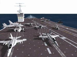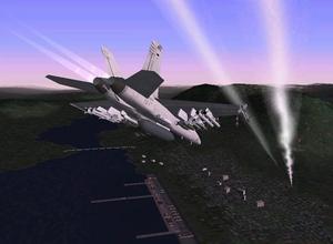 It's the proverbial "postage stamp" landing. Take one of the world's most powerful air-combat fighters, in this case the F/A-18 Super Hornet, one rocking and rolling deck of a United States Navy aircraft carrier and a fully interactive 3D rendered interactive cockpit. Mix the ingredients together and you've got the recipe for experiencing an aspect of modern Navy warfare of which legends abound or, conversely, the helplessness of unmitigated disaster.
