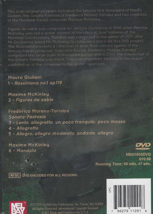 This is an original program including the famous first Rossiniana of Mauro Giuliani, the Sonata-Fantasia of Frederico Moreno-Torroba and two creations of the Montreal-based composer Maxime McKinley. Figures de sable was composed for Jérôme Ducharme in 1998 when Maxime McKinley was still a guitar student in the class of Jean Valliéres at the Montreal Conservatory. Mandala was composed in the winter of 2010 after Mr. Ducharme asked Mr. McKinley to compose a piece for this DVD project. The Rossiniana presents a collection of arias from various operas of the famous italian composer Gioachino Rossini. Frederico Moreno-Torroba composed few large scale instrumental pieces and in 2001, the manuscript of the Sonata-Fantasia was found. This is an important addition to the major contribution of the composer to the guitar repertoire.