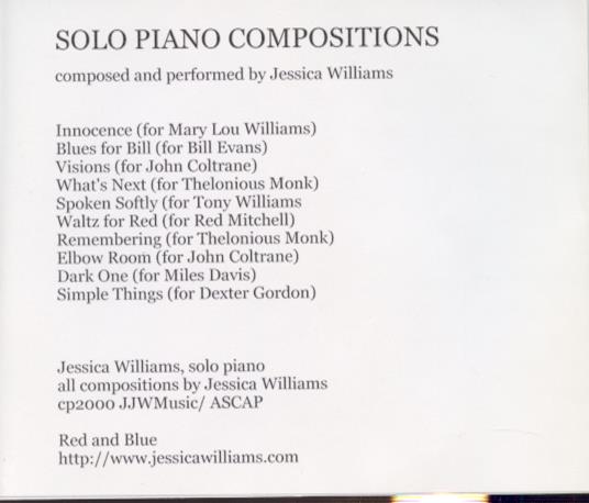 Jessica Williams is a jazz pianist known for her solo piano works, interpreting compositions by notable jazz figures with a delicate and expressive style. Composer and performer: Jessica Williams. All compositions are by Jessica Williams.