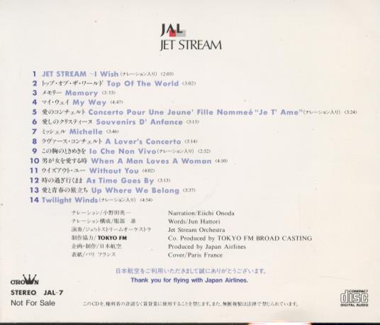 Narration: Eiichi Onoda. Words: Jun Hattori. Performed by Jet Stream Orchestra. Co-produced by TOKYO FM Broadcasting. Produced by Japan Airlines. Cover photo: Paris, France.