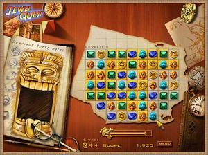 Jewel Quest is a puzzle game from MumboJumbo that challenges players to match three ancient treasures in a row. Themed music accompanies 180 puzzles set in Mayan ruins, and players can save their progress while playing full-screen or "Windows" mode. Explore the ancient ruins of Mayan civilization while discovering hidden treasures and priceless artifacts. In this unique new take on the classic-style matching game, you must rearrange valuable relics to turn sand tiles into gold. As you venture deeper into the jungle, you will encounter increasingly difficult puzzles containing secret twists, cursed items, and buried artifacts.