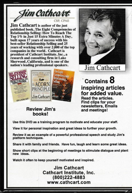 Jim Cathcart is author of the just published book, The Eight Competencies of Relationship Selling: How To Reach The Top 1Ͽn Just 15 Extra Minutes A Day, built upon 17 years of success with his best-seller Relationship Selling and 25 years of working with over 2.000 of the top companies in the world. Cathcart is president of Cathcart Institute. Inc.. a research and consulting firm in Lake Sherwood, California. and is one of the nation's leading professional speakers.