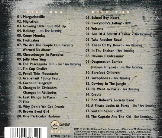 This collection contains 12 previously unreleased tracks including, 2 new songs, 6 alternate versions and 4 live recordings.Personnel: Jimmy Buffett (vocals, guitar); Peter Mayer, Mac McNally (vocals, gutiar); Jim Mayer (vocals, bass); Nadirah Shakoor, Tina Gullickson (vocals); Doyle Grisham (pedal steel guitar); Amy Lee, Tom Mitchell (saxophone); John Lovell (trumpet); Michael Utley (keyboards); Roger Guth (drums); Ralph McDonald (percussion).Producers include: Norbert Putnam, Don Grant, Jimmy Buffet, Michael Utley, Russ Kunkel. Compilation producers: Jimmy Buffet, Michael Utley.Recorded at Shrimp Boat Sound Studio, Key West, Florida; Seventeen Grand Recording, Nashville, Tennessee; Jupiter Recording, Jupiter, Florida. Includes a 32-page booklet with liner notes by Tom Corcoran.Personnel: Jimmy Buffett (vocals, guitar); Jim Mayer, Mac McAnally, Peter Mayer (vocals, guitar); Tina Gullickson, Nadirah Shakoor (vocals); Bob Weber (guitar); Tom Mitchell , Amy Lee (saxophone); John Lovell (trumpet); Michael Utley (keyboards); J.L. Jamison (drums, steel drum, percussion); Roger Guth (drums); Robert Greenidge (steel drum, timbales); Ralph MacDonald (percussion); Julie Harkness, Heather Perry (dancer).Audio Mixers: Chris Stone; Alan Schulman; Michael Utley.Liner Note Authors: Jimmy Buffett; Tom Corcoran.Recording information: Jupiter Recording, Jupiter, FL; Seventeen Grand Recording, Nashville, TN; Shrimp Boat Sound Studio, Key West, FL.Photographers: Savannah Jane Buffett; Noah Greenberg; Jim Shea; Fred Valentine; Ray Stanyard; Jean Pagliuso; Michael Ramos ; Tom Corcoran.Arranger: Coral Reefer Band.Jimmy Buffett had one gigantic pop hit back in 1977 with his ode to brain-drain, "Margaritaville." Buffett's laid-back combination of country, folk, and calypso also garnered him an huge cult following; his fans, dubbed Parrotheads, have helped him remain one of the top touring acts and a platinum-album creator for 25 years following his Top 10 hit. While many massively successful artists whose catalogue is overshadowed by one hit have been known to curse their fate, no one has embraced their hit with quite the zeal of the mellow Buffett, and indeed his latest double-CD collection is entitled MEET ME IN MARGARITAVILLE.Of course, the titular song is featured, as are Buffett's other minor hits (including underrated classics like "Come Monday"), many beloved fan favorites, and most importantly 10 brand new recordings. Eight of these revisit familiar Buffett songs, best of which is a rousing live version of "A Pirate Looks At 40." The remaining two are covers of the Fred Neil-penned "Everybody's Talking" and the Beach Boys' "Sail On Sailor," each perfectly suited to Buffett's voice and trademark island-flavored sound. MEET ME IN MARGARITAVILLE contains something for both Buffett's longtime fans and casual listeners who want a good collection of all the man's music in one place.