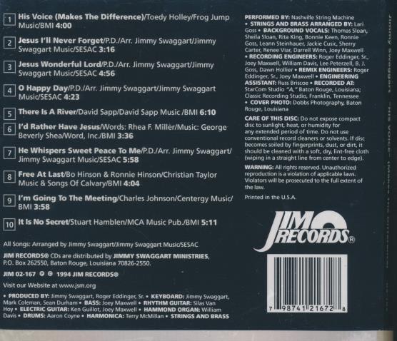All Songs: Arranged by Jimmy Swaggart/Jimmy Swaggart Music/SESAC. Produced by Jimmy Swaggart and Roger Eddinger, Sr. Recorded at StarCom Studio "A", Baton Rouge, Louisiana; Classic Recording Studio, Franklin, Tennessee. Cover Photo: Dobbs Photography, Baton Rouge, Louisiana. Printed in the U.S.A.