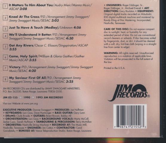 Executive Producer: Donnie Swaggart. Producer: Joe Huffman. Keyboards: Lari Goss, Dave Huntsinger. Bass Guitar: Gary Lunn. Drums: Clyde Brooks. Guitars: Brent Rowan, Bobby All. Orchestration: Lari Goss. Background Vocals: Marty McCall, Jackie Cusic, Sarah Huffman. Tambourine & Percussion: Terry McMillan. Orchestra: Nashville String Machine. Recorded at: The Music Mill, Nashville, Tennessee. Engineers: Roger Eddinger, Sr.; Roger Eddinger, Jr.; Michael Everett. Original digital tracks recorded on Mitsubishi 850 digital multitrack machine and mastered by Randy Kling at Disc Mastering, Nashville, Tennessee. JIM 02-155 ℗ 1990 © 1993 Jim Records. Printed in the U.S.A.