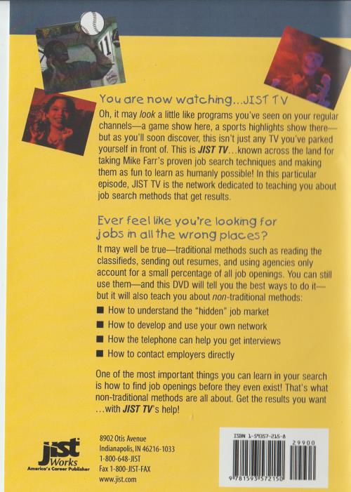 Oh, it may look a little like programs you've seen on your regular channels—a game show here, a sports highlights show there –but as you'll soon discover, this isn't just any TV you've parked yourself in front of. This is JIST TV...known across the land lor taking Mike Farr's proven job search techniques and making them as fun to learn as humanly possible! In this particular episode, JIST TV is the network dedicated to teaching you about job search methods that get results. MI* Ever feel like you're looking for jobs in oil the wrong places? It may well be true—traditional methods such as reading the classifieds, sending out resumes, and using agencies only account for a small percentage of all job openings. You can still use them—and this DVD will tell you the best ways to do it but it will also teach you about non-traditional methods: ■ How to understand the "hidden" job market ■ How to develop and use your own network ■ How the telephone can help you get interviews ■ How to contact employers directly One of the most important things you can learn in your search is how to find job openings before they even exist! That's what non-traditional methods are all about. Get the results you want ...with JIST TV's help!