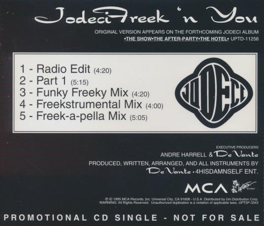 Jodeci are an American R&B quartet who rose to prominence in the early to mid-1990s. "Freek 'n You" is a sultry slow jam that showcases their blend of contemporary R&B and New Jack Swing influences. The single credits DeVante as producer, writer and arranger, with Andre Harrell listed as an executive producer. This promotional release features multiple remixes and alternate versions highlighting the group's signature vocal harmonies and production style.