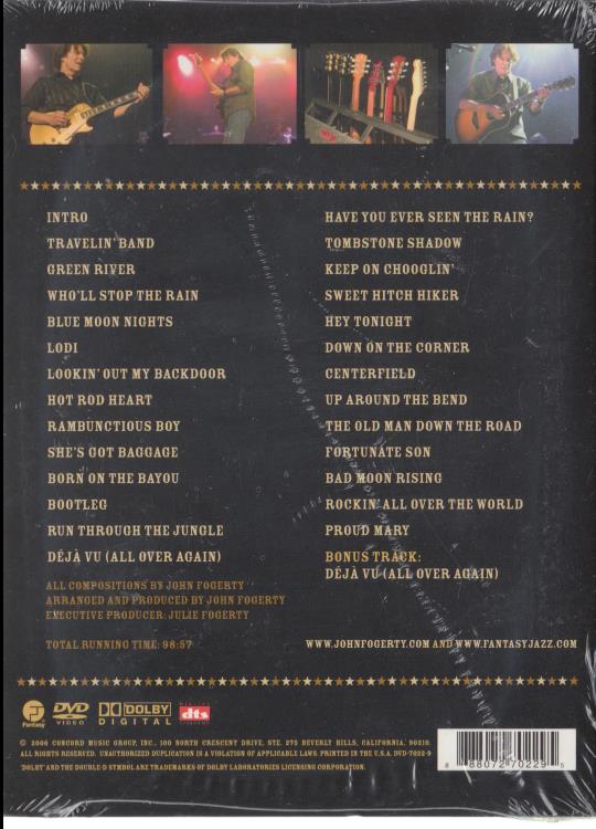 This concert release captures John Fogerty performing classic Creedence Clearwater Revival songs and solo hits live. The DVD features Fogerty and his band delivering energetic performances of signature tracks, plus a bonus studio track.