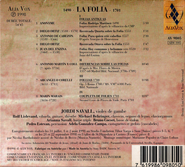 Arcangelo Corelli, Marin Marais, Antonio Martín y Coll, Diego Ortiz & Anonymous, Jordi Savall, Rolf Lislevand, Michael Behringer, Arianna Savall, Bruno Cocset, Pedro Estevan, Adela González-Campa: La Folia (1490-1701)