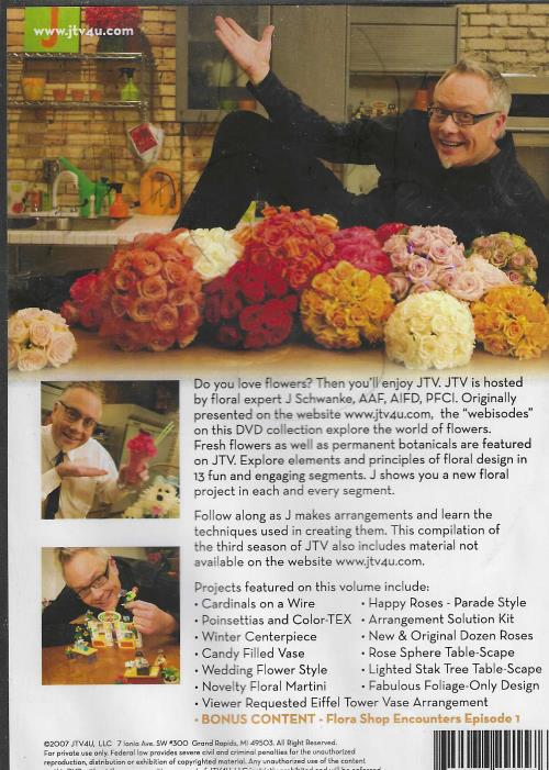 Do you love flowers? Then you'll enjoy JTV. JTV is hosted by floral expert J Schwanke, AAF, AIFD, PFCI. The "webisodes" on this DVD collection explore the world of flowers. Fresh flowers as well as permanent botanicals are featured on JTV. Explore elements and principles of floral design in 13 fun and engaging segments. J shows you a new floral project in each and every segment. Follow along as J makes arrangements and learn the techniques used in creating them. This compilation of the third season of JTV also includes material not available on the website.