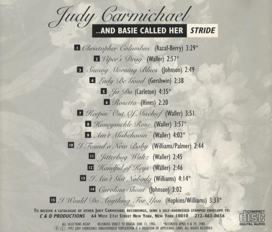 Judy Carmichael: ...And Basie Called Her Stride MUSIC AUDIO CD 90s jazz 1993 C&D