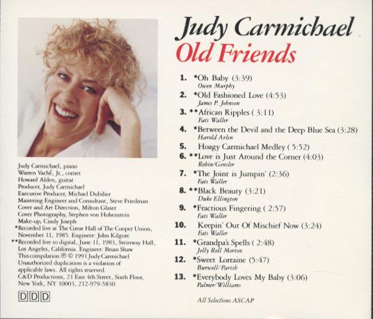 Judy Carmichael is an American jazz pianist celebrated for her sparkling stride and swing approach. Old Friends highlights her deft touch and sensitive interpretations of classic jazz repertoire. The album draws from early jazz composers and popular standards, presented in piano led arrangements with warm accompaniment. These performances emphasize melody, rhythmic drive, and a tasteful sense of swing.