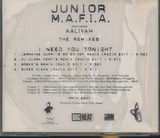 Junior M.A.F.I.A. (featuring Aaliyah): I Need You Tonight (The Remixes) 4-Track Promo w/ Hype Sticker & Stuck Back Artwork