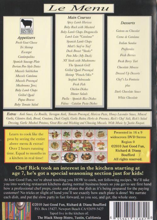 In this edition, we join Chef Richard "Rick" Boufford in his kitchen at The Black Sheep Bistro in Tustin, California as he prepares the entire menu right before your eyes; appetizers, main courses, desserts, sauces, bread, rice & potatoes, salads & dressings, confit of duck and much more. He'll show you how to season the Black Sheep way, and even how to make your very own seasoning mix. And since Boufford's been playing in the kitchen since he was 7, there's a special section specifically for kids showing how he learned to season and demonstrating how they, too can safely get involved! with more than 60 demonstrations, taped live in the restaurant's kitchen.