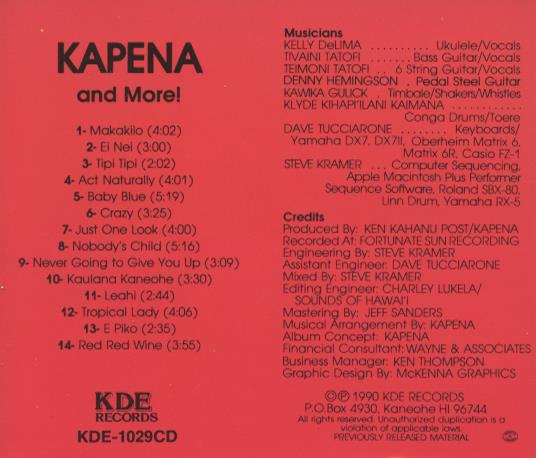 Musicians (as listed on the insert): ukulele/vocals, bass guitar/vocals, 6-string guitar/vocals, pedal steel guitar, timbales/shakers/whistles, conga/drums/percussion, keyboards and computer sequencing. Production credits on the insert include production by Ken Kahanui Post/Kapena, engineering and mixing by Steve Kramer, mastering by Jeff Sanders, and musical arrangements by Kapena. Label: KDE Records. Catalog number: KDE-1029CD.