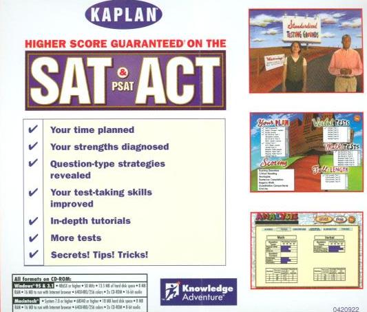 You've purchased the best test prep software on the market, the software that's more fun than an abacus and more educational than an overhead projector. Higher Score on the SAT and ACT is the most comprehensive, instructive, and entertaining software product in the field of test prep to arrive since.. .well. since the dawn of humankind! In this software, you get: • Interactive Lessons detailing the famed Kaplan approaches to each question type: • Full-length and Practice Tests, so that you can try out your new skills as you move through the sessions: • A Plan detailing your own personalized study plan based on your needs: • A Math reference section, for reviewing mathematical concepts: • Math, Grammar and Vocabulary Flashcards; • Fast-action games for reviewing Vocabulary and Math for the SAT, and Math, Grammar and Science for the ACT: • Invaluable Admissions information and morel