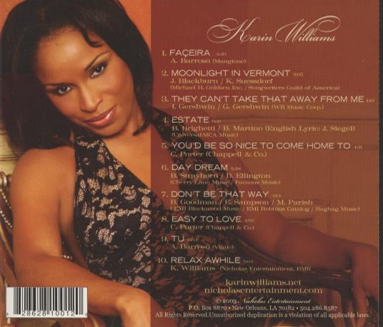 Karin Williams is a jazz vocalist whose self-titled album showcases her smooth, soulful voice. The album blends elements of smooth jazz and vocal jazz to create a relaxing and intimate listening experience. Featuring classic standards and original works, Karin embodies a sophisticated style that appeals to jazz aficionados. Based out of New Orleans, Nicholas Entertainment supports her musical ventures.