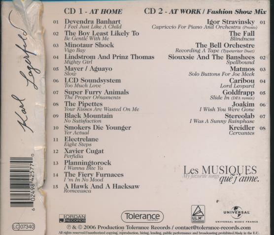 Karl Lagerfeld curated this two-CD compilation of tracks he favored. The collection mixes contemporary indie, electronic and experimental pieces alongside classical touches, reflecting Lagerfelds eclectic taste. The set is presented as two listening contexts, "At Home" and "At Work / Fashion Show Mix", showcasing a range of moods from intimate to runway-ready. Artists featured range from Devendra Banhart and LCD Soundsystem to Siouxsie And The Banshees and Igor Stravinsky.