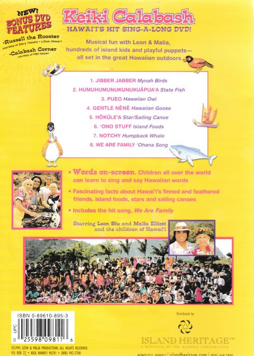 Musical fun with Leon & Malia, hundreds of island kids and playful puppets—all set in the great Hawaiian outdoors AA—1. JIBBER JABBER Mynah Birds 2. HUMUHUMUNUKUNUKUAPUA'A State Fish 3. PUEO Hawaiian Owl 4. GENTLE NENE Hawaiian Goose 5. HOKOLEA Star/Sailing Canoe 6. 'ONO STUFF Island Foods 7. NOTCHY Humpback Whale 8. WE ARE FAMILY Vhana Song • Words on-screen. Children all over the world can learn to sing and say Hawaiian words • Fascinating facts about Hawai`i's finned and feathered friends, island foods, stars and sailing canoes • Includes the hit song, We Are Family Starring Leon Siu and Malia Elliott and the children of Hawaii
