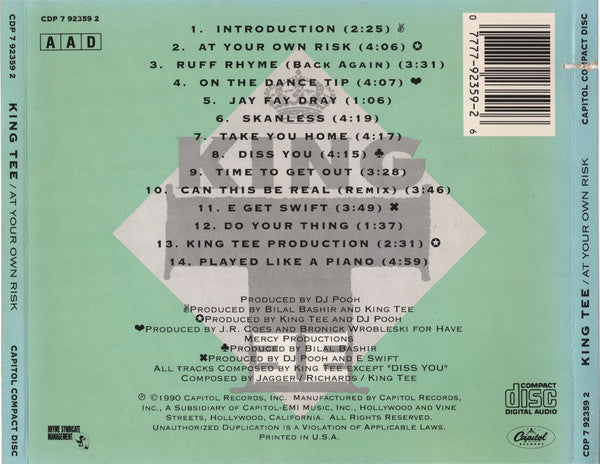 King Tee: At Your Own Risk MUSIC AUDIO CD early 90s gangsta hip hop rap 1990 OOP