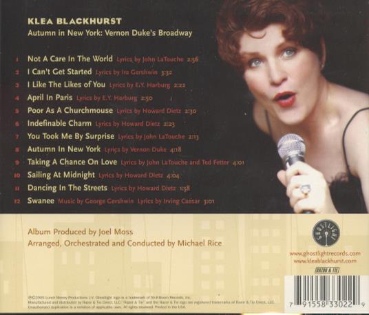 Klea Blackhurst is a vocalist and performer who specializes in material from Broadway and the Great American Songbook. This release focuses on songs by composer Vernon Duke, presented with theatrical flair and jazz-influenced arrangements. Her interpretations emphasize classic vocal phrasing, storytelling, and cabaret-broadway sensibilities. The album features full orchestral arrangements and polished production.