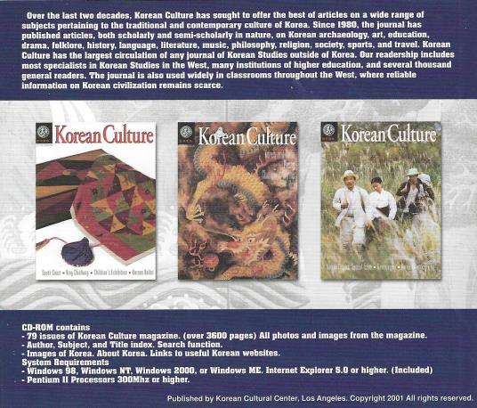 CD-ROM contains - 79 issues of Korean Culture magazine. (over 3600 pages) All photos and images from the magazine. - Author, Subject, and Title index. Search function. - Images of Korea. About Korea. Links to useful Korean websites.